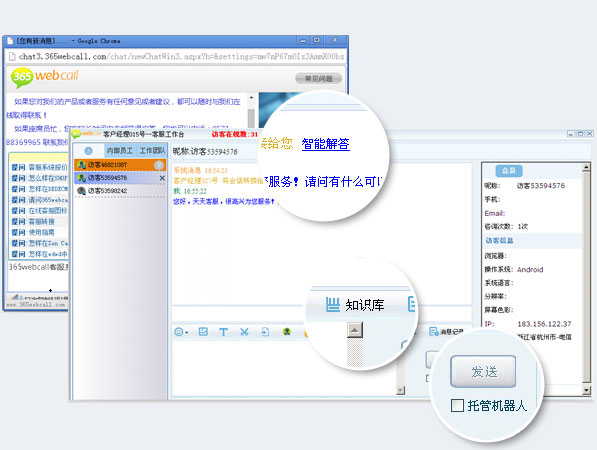 365webcall智能機器人是一款具有智能化、雙引擎(自然語言與關鍵字相結合)、全媒體、