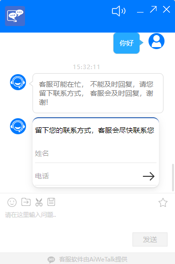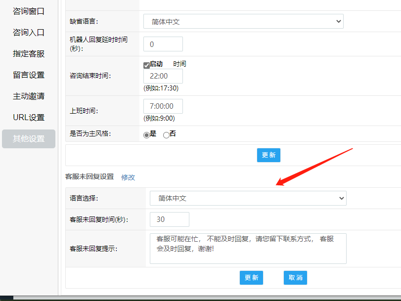 訪客可在客服休息時間或忙碌未及時回復(fù)時將自己的聯(lián)系方式留下,等待客服回呼解決問題,可在“系統(tǒng)設(shè)置-媒體對接-網(wǎng)頁(網(wǎng)站)-設(shè)置-咨詢?nèi)肟凇?/span>